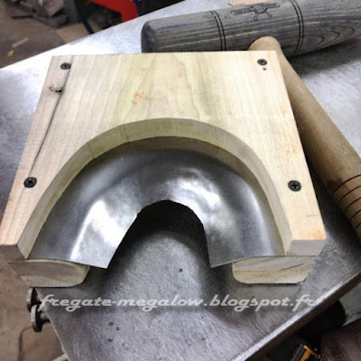 Une forme en bois sert de guide de formage et sert la tôle en sandwich :